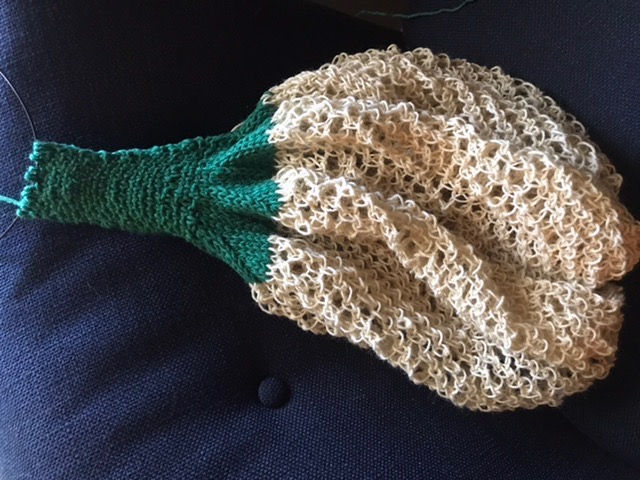 This is my progress for today. I found out the hard way that magic loop does not work for this project. I also found out that you can not change to circular needles until the bottom can spread out at the bottom of the needles.