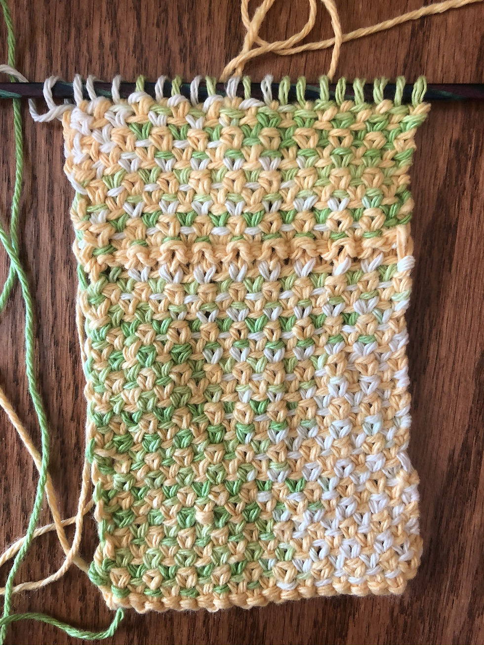 I am a retired teacher. I have a cat named Purl who is a lot of company. She loves yarn and tries to grab it. I am using yellow and green yarn.